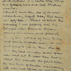 I think I have seen today one of the most extraordinary sights that anyone has ever seen. About 10 o’clock this morning I was peeping over the parapet when I saw a German, waving his arms, and presently two of them got out of their trench and came towards ours.