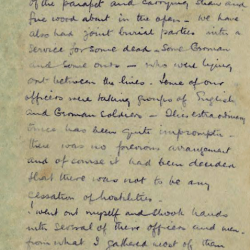 For the rest of the day nobody has fired a shot and the men have been wandering about at will on the top of the parapet and carrying straw and firewood about in the open – we have also had joint burial parties – with a service for some dead – some German and some ours, who were lying out between the lines…