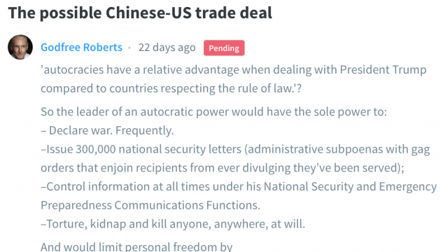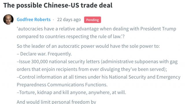 Until two weeks ago my comments on China in mainstream media attracted thousands of responses (one-third angry) from millions of readers and provided priceless exposure for my upcoming book, I hoped. My readership stats climbed steadily until I received an email from Patrice Greanville on April 4 with a warning from Google:
