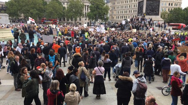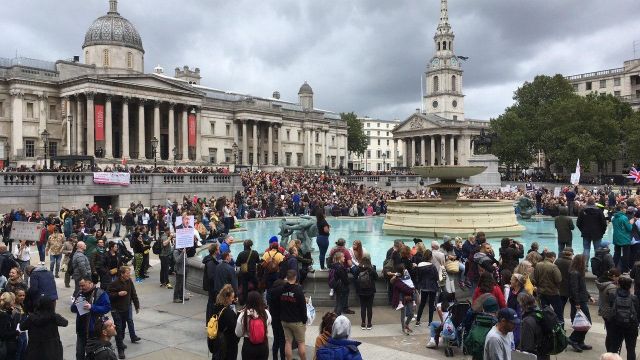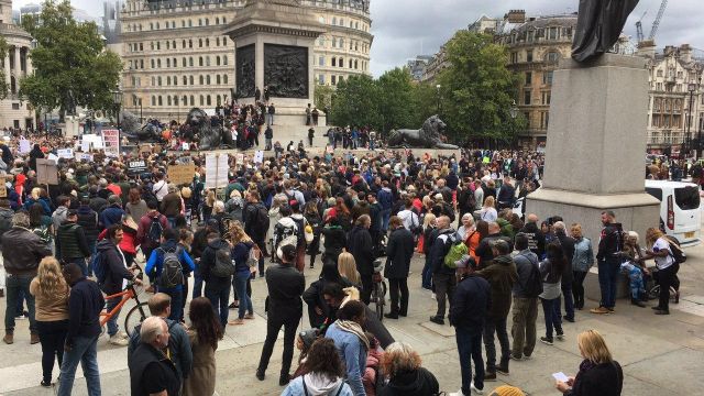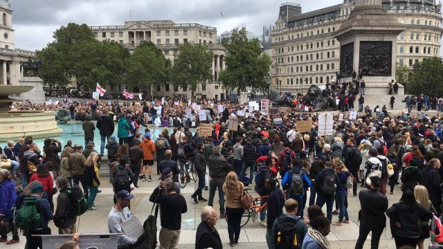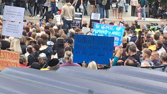 “Thousands gathered in London’s Trafalgar Square on Saturday to protest against lockdown restrictions, vaccines, 5G and supposed establishment plots.”
