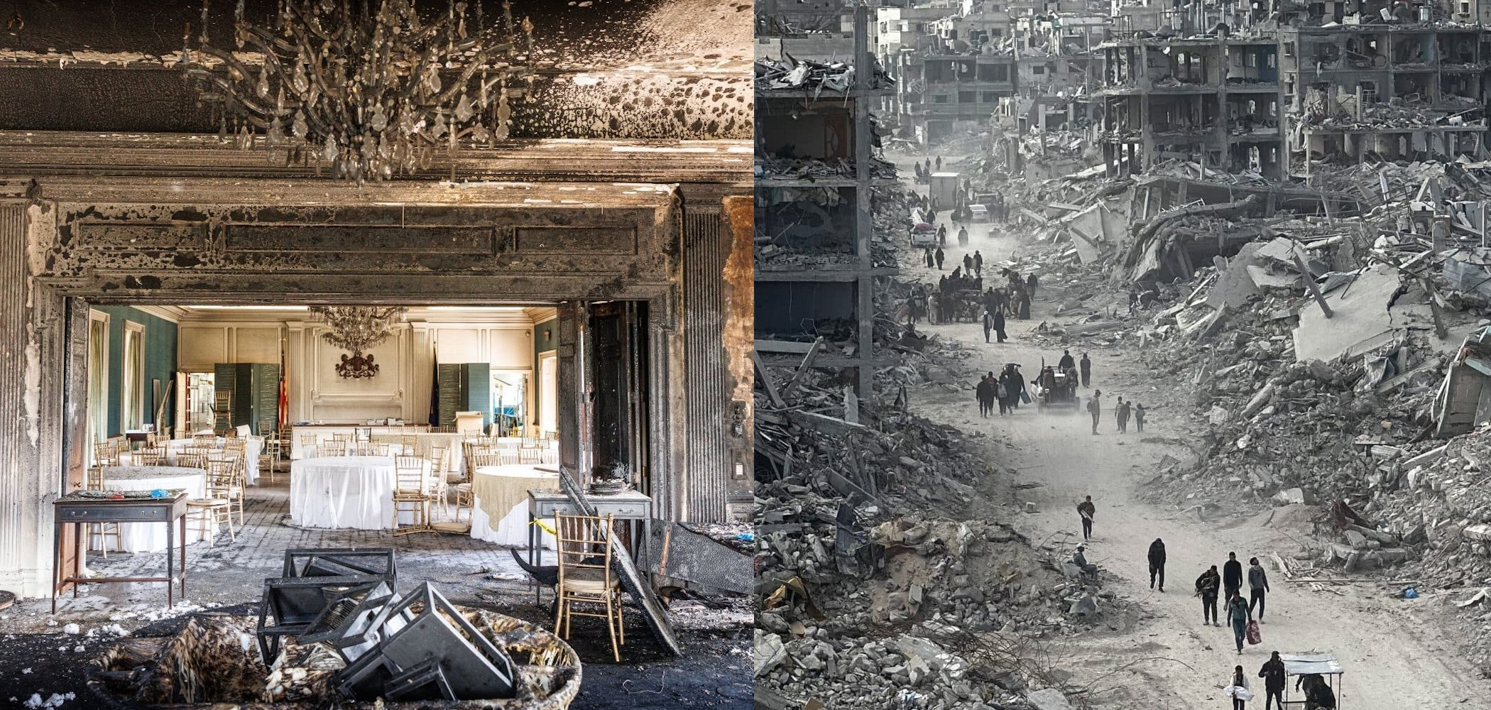 The fire-damaged Governor's Mansion (left) and the destruction of Gaza (right)