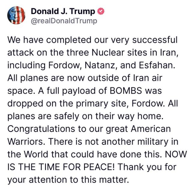 Less than an hour ago, President Donald Trump announced that the US Air Force had conducted “targeted strikes” on Iranian nuclear sites.