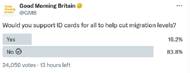 Good Morning Britain ran a twitter poll to judge support for the planned Digital ID scheme. Here are the results: