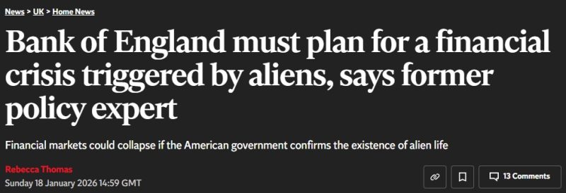 Speaking of space, did you know that the Bank of England has been told to game-plan for a financial crisis caused by the American government admitting aliens are real?