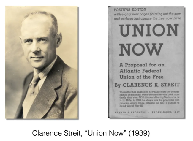 In 1939 Clarence Streit proposed unifying North America and Europe into an Atlantic Union, which would serve as the first phase toward integrating the rest of the world into world union.