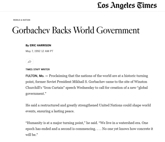 Through his Green Cross International, Gorbachev was an advocate for environmentalism (now climate changeism, as I call it) which would serve as the pretext for the very world government he was subsequently proposing.