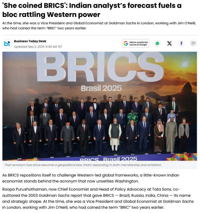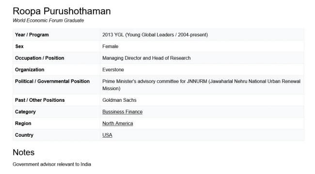 BRIC was purportedly coined by Goldman Sachs’ Jim O’Neill in 2001, but everyone fails to mention his 2003 report co-author Roopa Purushothaman who helped cement BRICs. Purushothaman is a WORLD ECONOMIC FORUM GRADUATE and YOUNG GLOBAL LEADER.