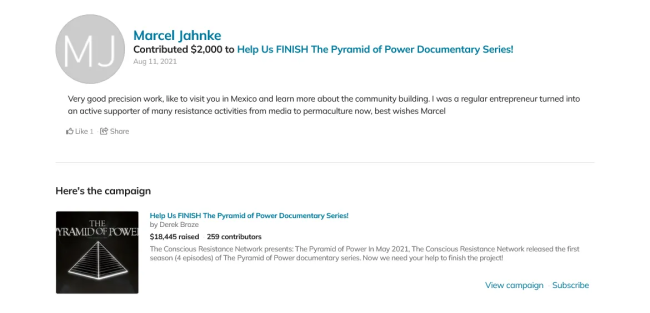 Someone also discovered that Marcel had been attempting to make inroads with some of the anti-globalist anarchist crowd, such as Derrick Broze of Conscious Resistance. Marcel had donated to Derrick’s documentary and Derrick confirmed to me that he had no recollection of having any interactions or conversation with Marcel.