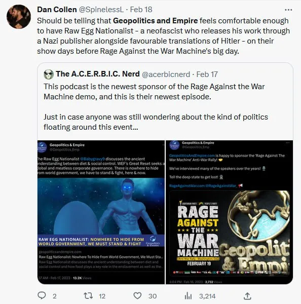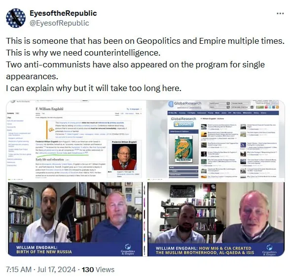 They would go through my Geopolitics & Empire and TNT Radio interviews cherry picking screenshots of guests they didn’t like, namely multipolaristas, like Matthew Ehret. What a coincidence!
