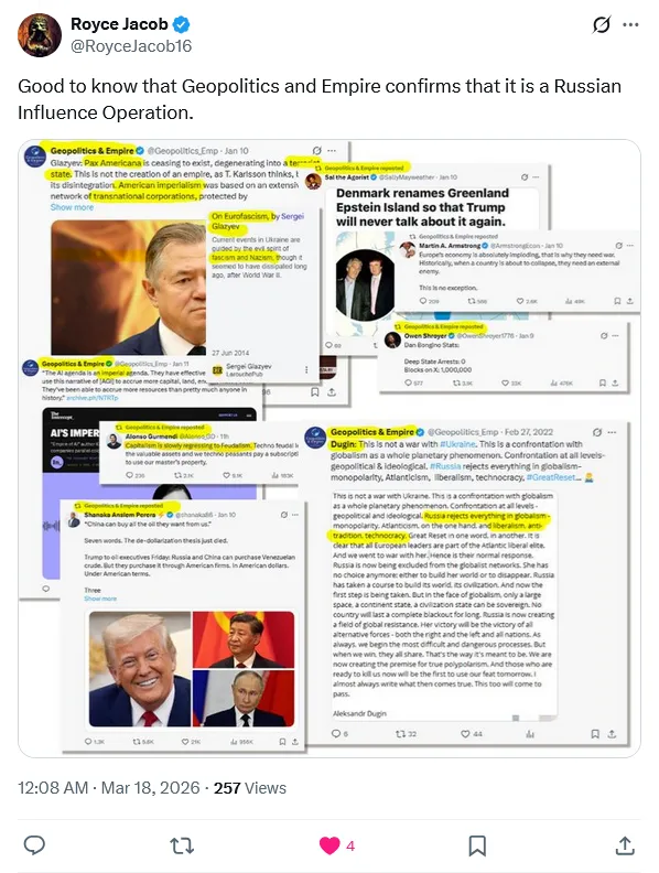 I am (was?) a huge fan of Michael O’Fallon but to my dismay, found him to be reposting this network. https://x.com/SovMichael