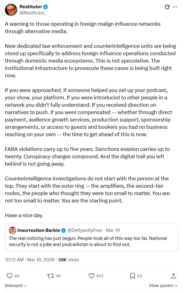 ♱ Rurik Christwalker ♱ has a wild thesis suggesting some of them to be part of U.S. information operations, with unclear objectives. Perhaps to promote the globalist multipolarity narrative in general? To create the boogeyman of multipolarity so as to warrant a stronger reaction from and more funding for the Military-Industrial-Complex? To serve, again, as pretext for bringing in further censorship measures?