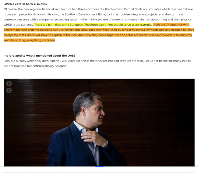 There is a traced path there, which is the European one. The European Union should serve as an example for us: there are 27 countries with different political systems, religions, culture, history and languages that killed each other by the tens of millions a few years ago and decided to unite. I always say that Europe will have to explain to its children why they joined and we Latin Americans will have to explain to our children why we took so long.”