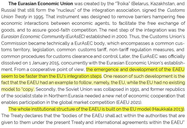 In 2015 the Eurasian Economic Union (EAEU) became the latest version of integration in the post-soviet space, bringing together Russia, Kazakhstan, Belarus, Armenia and Kyrgyzstan in a Union, taking the European Union as its model.