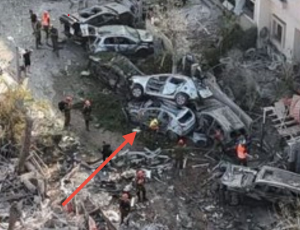 How are the fences still standing when the cars beside them are crushed flat? Why is there no blast residue, no scorched ground, no debris scattered beyond the frame? Who stopped to plant Israeli flags in the wreckage—and why do the buildings collapse inward like controlled demos, not chaotic strikes?